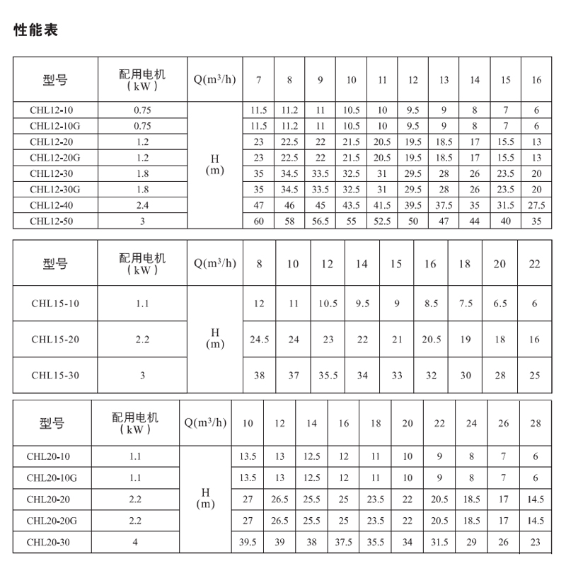 • CHL2-30‌:电机功率0.55kW,流量28m³/h,扬程32m。