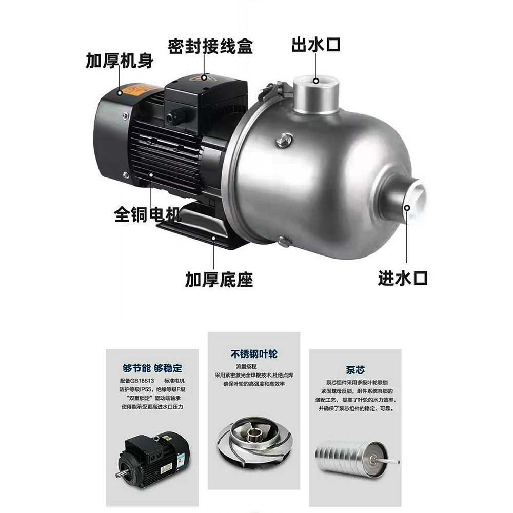 • 材质与结构‌:采用‌不锈钢‌材质,耐腐蚀性强;叶轮导叶由不锈钢板冲压焊接制成,结构紧凑。